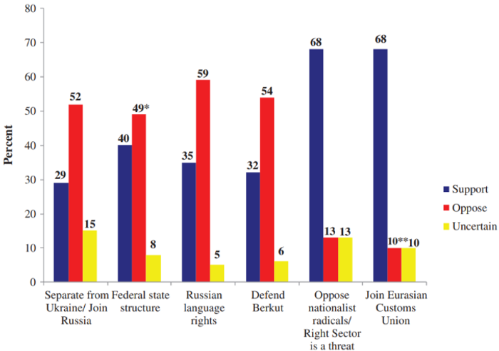 - 돈바스 지역의 러시아어 사용 인구는 확실히 비중이 높다. 2001년 인구조사 결과에 따르면, 남부 크리미아와 동부 돈바스 지역에서 러시아어를 모어로 삼는 인구 비중은 70퍼센트를 상회한다. 하지만 이것이 곧 러시아로의 편입을 지지하는 입장으로 이어지진 않는다. 상기한 바와 같이 돈바스 지역에서 우크라이나로부터 분리하여 러시아로의 편입을 지지하는 비중은 29%에 불과했고, 반대한다는 입장은 52%이다. 하지만 그렇다고 해서 친유럽이라고도 규정할 수 없다.