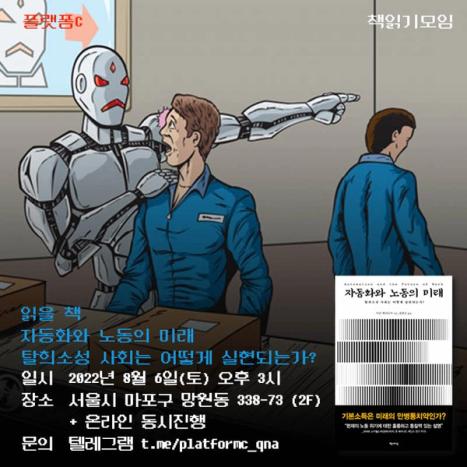 8월에는 아론 베나나브의 저서 [자동화와 노동의 미래]🗯️를 함께 읽습니다. 경제사학자인 저자는 인간의 일자리가 사라지고 로봇이 그 자리를 대신할 것이라는 최근의 자동화 담론을 이론 논의와 통계 검토를 통해 비판하고, 인공지능 기술에 대한 두려움에 기반한 여러 주장을 논파합니다. 기본소득을 통해 사회가 일신될 것이란 주장을 비판하고, 인간에게 사회를 바꿀만한 힘이 있다는 믿음에 동의한다면서, 사회운동의 혁신을 통해 우리 사회의 미래를 직접 상상하고 실천해야 한다고 역설합니다.