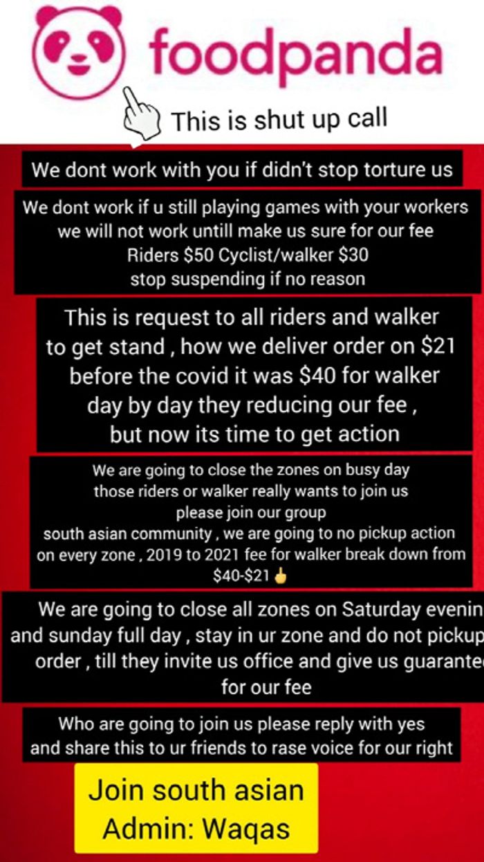 몇 년 동안 푸드판다 배달 노동자들은 많은 문제를 겪느라 고통을 받았다. 그 중에서도 임금 삭감과 (정직 혹은 계약해지라 명명된)부당해고, 배달기사들이 받는 엄격한 통제와 규율, 납품 거리 과소 산정, 회사의 비효율적인 지원과 불충분한 합의와 같은 문제가 시급했다. 2020년 말부터 소규모 사무실에서 파업과 탄원이 산발적으로 일어났지만 회사 측은 거의 변화가 없었다.