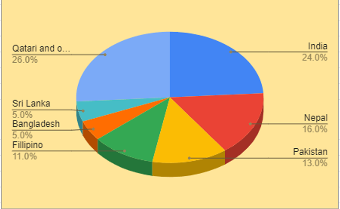 카타르 통 계청에 따르면 카타르엔 290만 명이 넘는 사람들이 살고 있다. 카타르 시민권자는 33만 명에 불과하고, 인도(70만)나 네팔(40만), 방글라데시(40만) 이주노동자들이 훨씬 더 많은 분포를 차지한다. 이들은 브로커를 통해 이주노동을 왔다가 불투명한 계약관계와 임금 체불 등으로 이러지도 못한 채 사실상 강제노동에 시달려왔다.