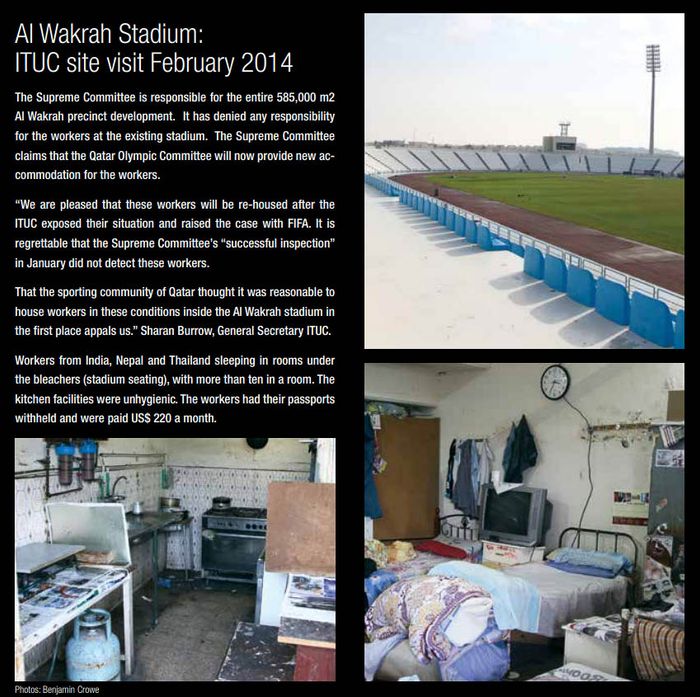 사실 카타르 월드컵 건설 과정의 열악한 노동조건과 강제노동, 중간 수탈 문제 등에 대해선 무수히 많은 비판과 시정 요구가 있어왔다. 일찍이 국제노총(ITUC)은 2014년 3월에 발표한 보고서를 통해 2010년 말부터 2013년 말까지 3년간 총 1,239명이 산재로 목숨을 잃었으며, “지금의 노동조건을 개선하지 않을 경우 매주 12명, 매년 600여 명이 목숨을 잃을 것”이라고 경고한 바 있다. 향후 동남아시아와 남아시아에서 50만여 명의 노동자들이 이주해올 것이 예상되는 상황에서, 최소 4천 명이 산재로 사망한다는 것이다. 심지어 카타르 정부의 의뢰로 조사 업무를 맡은 DLA 파이퍼(Piper) 로펌 역시 국제노총과 비슷하게 추정하고, 이에 더해 방글라데시 출신 노동자들의 경우 약 1천800명이 사망했다고 발표했다.