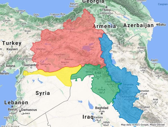 오늘날 쿠르드인은 크게 4개국에 걸쳐 분포해 있다. 쿠르드족 민중이 살아가는 영역을 기준으로 할 때, 튀르키예는 '북쪽'을 의미하는 바쿠르(Bakur), 시리아 북부는 서쪽을 의미하는 로자바(Rożawa=서쪽), 이란 서부는 동쪽을 의미하는 로힐라타(Rojhilatê), 이라크 북부는 남쪽을 뜻하는 바스라(Başûrê)로 불리고 있다. 전체 쿠르드인의 55% 정도는 튀르키예 동부 바쿠르에 살고 있는데(튀르키예 인구의 20%), 튀르키예 정부로부터 심각하게 억압받고 있다. 이에 반해, 바스라의 쿠르드족은 이라크 정부로부터 자치를 인정받고 있다.