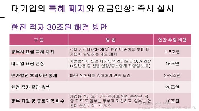 작년 한국전력의 적자가 약 32조원에 달했다. 적자를 줄이기 위해서는 부당한 지출구조를 바로 잡고, 부당한 요금구조 역시 바로잡아야 한다. 먼저 위에서 지적한 민자발전의 초과이윤을 억제하기 위해 SMP 상한제를 1년 동안 상시적으로 적용할 경우 현 제도를 통해서 2조원가량의 전력구매 비용을 줄일 수 있다.