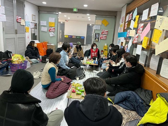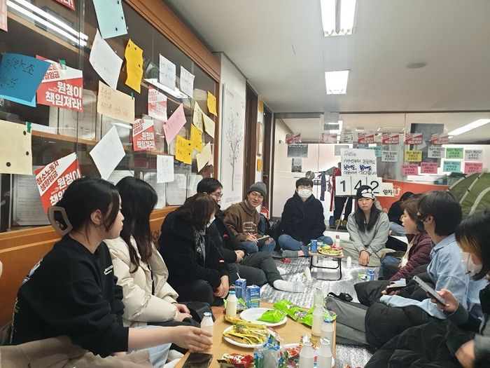저희가 아직 총장님이나 이사님 집 앞에서 1인시위하고 그런 건 안 했어요. 여기 총장실 점거 농성도 안 했거든요. (당시 농성장은 총장실 앞 복도였다.) 그런 점거 농성은 그냥 들어가서 앉아 있으면 되는 거죠. 주변분들한테도 어떤 걸 해보면 괜찮을 것 같다는 조언을 받아서 계속해야 할 것 같아요.