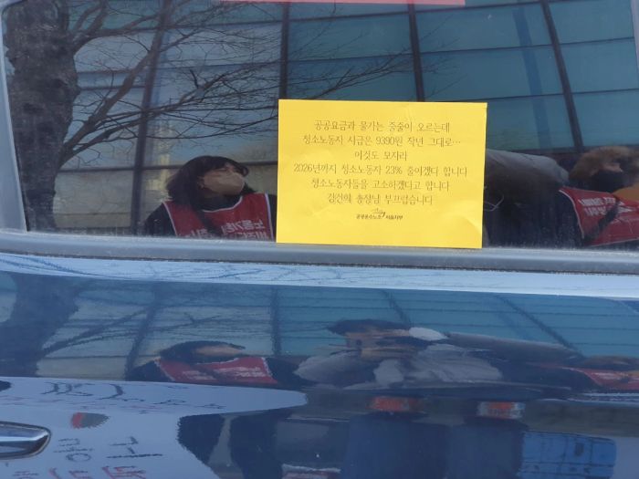 청소노동자🧹 : 2022년도에 합의가 안 됐잖아요. 2021년도에 했죠. 임금 인상은 매년 해요. 법정 최저임금이 올라가면 그 수준으로 인상시키는 거죠. 근데 저희가 최저임금보다 시급 230원을 더 받아요. 그걸 엄청 싫어하더라고요. 최저임금만 받으라는 거죠.