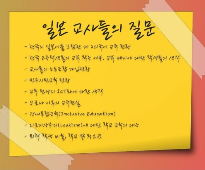질문 하나만으로도 나눌 이야기가 너무 많은 주제여서, 쟁점 사안에 대한 이야기는 나누지도 못하고 짧게 현황 중심으로만 전달한 것이 아쉽다. 언어의 장벽이 있고, 사회문화적 맥락이 달라 충분히 뜻을 전달하기 어렵다는 한계를 느끼면서 답변을 드렸는데도, 일본 선생님들이 눈을 초롱초롱 빛내며 경청하는 모습에 깊은 감동을 받았다. 어떤 맥락에서 질문하셨는지, 일본에서는 어떤 고민을 하고 계시는지 너무 많은 것들을 묻고 싶었지만 시간이 넉넉하지 않았다.