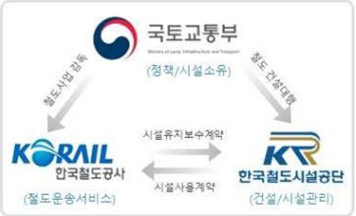 2003년 12월, 한국철도공사법이 입법되면서 한국의 철도산업구조는 철도청의 관리에서 국토교통부(이하 국토부), 국가철도공단(한국철도시설공단의 후신, 이하 철도공단), 한국철도공사(KORAIL, 이하 철도공사)의 관리 하에 놓이게 된다. 국토부는 시설을 소유하고 정책을 적용시키며, 철도공단이 철도 건설을 대행하고, 철도공사는 철도사업에 대한 감독 권한을 갖 는다. 철도공단은 철도 건설 및 관리 기능을, 철도공사는 철도 운영 및 유지·보수·관제 기능을 수행한다. 철도공사는 철도공단과의 시설유지보수계약을 통해 철도 운영 및 유지 업무를 수행하고, 철도공단은 철도공사와의 시설사용계약을 통해 시설사용료를 받는다. 즉 상하분리 체제에서 철도공단은 철로(하)를, 철도공사는 열차(상)를 맡는다고 말할 수 있다.
