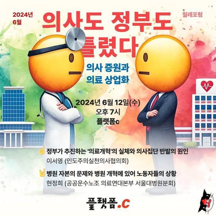 지난 6월 12일, 플랫폼C는 월례포럼 "의사도 정부도 틀렸다: 의사 증원과 의료 상업화"를 열었다. 포럼에는 끝나지 않을 것만 같은 정부와 의사 간 강대강 대치 속에서 이들과는 다른 해결법을 모색하고자 하는 이들로 가득 찼다.