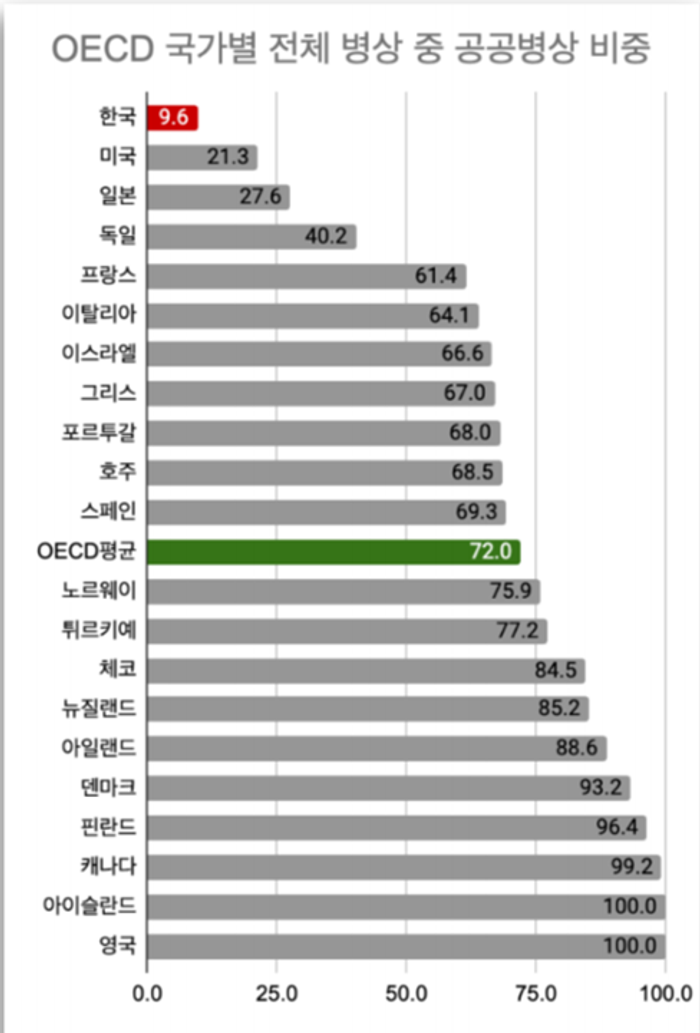 “세계 최고 수준의 병상 수”라고 하지만, 한국의 공공병원이 보유한 병상은 전체 병상의 10%도 채 되지 않는다. OECD 평균이 72%니 세계 최하위 수준이다. 여기에는 역사적 배경이 있다. 분단 이후 공공 의료를 택한 북한과 달리 한국은 의사들의 주도 아래 시장 의료를 택했다. 이후 건강보험이 도입되면서 민간 자본이 영리 성을 목적으로 점차 민간병원을 우후죽순 세운 결과 지금과 같은 상황이 펼쳐지게 됐다. 이처럼 공공의료가 절대적으로 부족한 현실에 노무현 정부는 4조 원의 예산을 투입해 전체 의료기관의 30%를 공공의료로 하겠다고 공언했다. 동시에 규제를 완화해 민간병원의 영리화를 지원했다. 하지만 전자의 약속은 사라지고 후자만 이루어졌다. 노무현 정부 이후에도 정부는 공공의료 대신 민간의료의 영리화를 위한 행보만 보였다. 이 과정에서 공공병원은 물론이고 중소형병원도 대형병원에 밀려 사라지면서 의료공백은 점차 심화되고 있다.