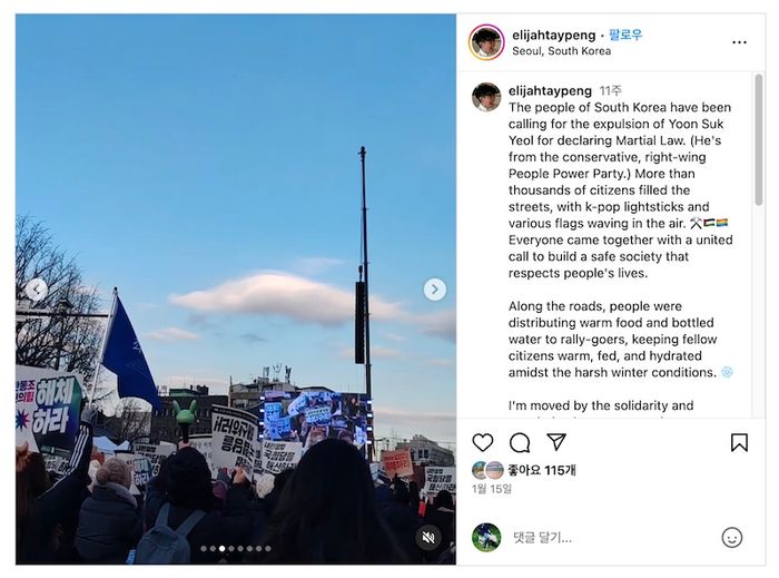 일라이자 | 저는 눈 내리는 날에도 밤낮으로 공동의 이익을 위해 투쟁하고, 그 모든 과정에서 서로를 돌보는 신념과 연대에 대해 큰 감동을 받았습니다. 싱가포르에서도 민중의 힘이 계속해서 성장한다면 언젠가는 수십만 명의 사람들이 며칠 동안 거리에서 이런 민주주의를 경험할 수 있지 않을까 하는 희망을 갖게 되기도 했고요. 우리 모두가 집권 엘리트와 현 정부가 얼마나 우리의 이익에 반하고 있으며 우리의 삶을 위험에 빠뜨리고 있는지 알고, 또 느끼고 있기 때문에 언젠가는 반드시 가능할 것이라 믿습니다.