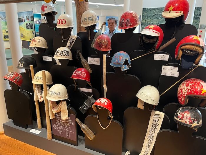 전시물 중 가장 눈에 띄는 건 당시 일본 학생운동의 특징이었던 여러 헬멧이었다. 혁공동(日本革命的共産主義者同盟), 중핵파, 통신파(通信派) 등 각자 여러 정파들의 이름을 새기고 빨간색이나 흰색으로 칠한 헬멧들이었다. 한국 노동운동이 작업 안전모를 쓰고 시위에 나온 것과 달리 대부분 제국주의 일본군에서 쓰인 ‘90식 철모’나 70년대풍 오토바이 헬멧에 색을 칠한 것이 많았다. 한국전쟁 이후 한국에서 미군 M1철모가 그랬듯, 이 ‘90식 철모’는 민간에서도 안전모 등으로 자주 쓰였고, 일본 전경의 철모로 채택되어 80-90년대까지 같은 철모를 쓴 이들이 치고 받는 광경이 자주 있었다. 중국에서도 일본군으로부터 노획한 90식 철모가 많았는데, 이 때문에 소련군 철모가 아니라 90식 철모를 채택해 80년대까지 사용했다. 한국과 중국의 산업화 모델까지 겹쳐 일본 제국이 동아시아 근현대에 남긴 영향을 실감한 장면이었다.