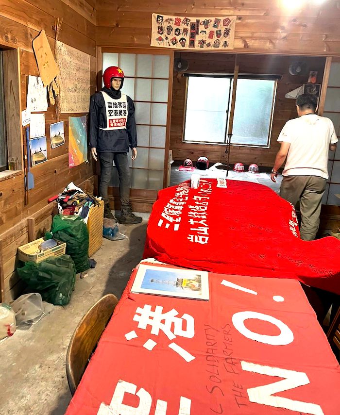 마지막으로 향한 곳은 철탑이었다. 1970년대에 망루 역할과 항공기 이착륙 제한을 위해 여러 철탑이 세워졌는데, 우리는 그 중에서 가장 높은 철탑으로 향했다. 이전에는 30m였 으나, 노후화와 안전 문제로 활동가들이 15m로 줄였다고 한다. 여전히 높은 그 철탑 옆에는 작은 건물이 있었고, 안에는 오키나와 활동가들이 1972년 오키나와 반환 직후 산리즈카에 연대하러 와서 글귀를 적어놓은 깃발, 프랑스 활동가가 남긴 지지 메시지가 테이블 위에 놓여 있었다. 철탑이 서 있는 땅을 구매한 활동가가 90세를 넘긴 고령까지 소유권을 유지하고 있었다. 그렇기에 철탑은 살아남을 수 있었다. 변색 하나 없이 마치 어제 글을 쓴 것마냥 남아있는 깃발에는 “연대를 구하되 고립을 두려워하지 않는다”, “모택동 사상으로 무장하여 싸움을 올바르게 발전시켜 승리를 쟁취하자”, “인민의 승리는 반드시 온다” 등 문장들이 이리저리 써있었다.