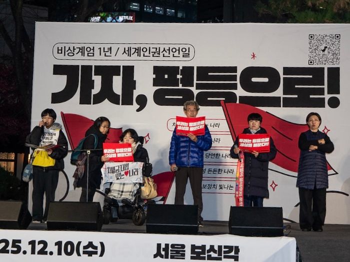 2025년 12월 10일 저녁 7시 서울 보신각 앞에서 78개의 사회운동 단체와 진보정당이 함께한 ‘가자, 평등으로! 12.10 민중의 행진’이 열렸다. 1년 전 비상계엄을 선포했던 윤석열뿐 아니라 민중의 삶을 억압하는 불평등을 끝내고 평등한 사회로 나아가고자 하는 사람들이 광장에 다시 모인 것이다.