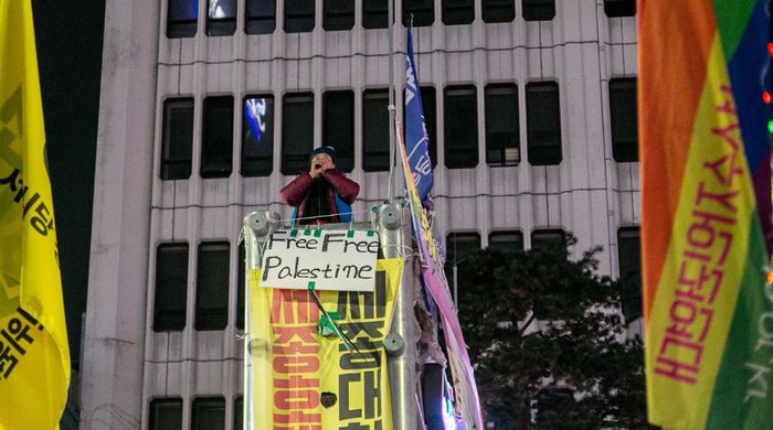 플랫폼C 민희 활동가와 HIV/AIDS인권행동 알의 소주 활동가가 공동 사회를 맡아 진행된 행진은 활력이 넘쳤다. 행진 도중에는 남태령과 한강진에서 농민들과의 연대했던 경험, 그리고 퀴어 퍼레이드에 농민들의 직접 재배한 오이와 복숭아로 연대에 화답했던 기억을 전한 시민 당근의 발언이 이어졌다. 이어서 무단 공학 전환에 저항하는 동덕여대 재학생이 발언에 나섰다. 그는 “일주일 전 12월 3일, 김명애 총장이 2029년부터 동덕여대를 공학으로 전환하겠다고 발표한 것이 또 하나의 계엄처럼 느껴졌다”고 말했다. 지난해 11월, 학생 2천여 명이 모여 학생총회를 열고 공학 전환 반대 의사를 분명히 발혔음에도 학교 측은 이를 무시한 채 일방적으로 계획을 발표했다. 이후 의사 전달을 위해 다시 진행한 투표에서도 3,470명이 참여해 86%가 공학 전환에 반대했지만, 학교는 여전히 이를 일부 의견으로 치부하고 있다. 그는 연대를 호소하며 “모두가 평등한 사회를 살 수 있을 때까지 광장에서 함께하겠다”고 밝혔다.