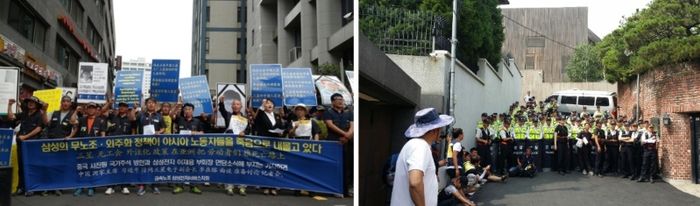 Maintaining the strike was very important. If the same struggle continued with the same slogans, the workers might find it boring or lose morale. Therefore, we always thought about how to keep this struggle inspiring for the workers. We tried to deploy different tactics every day during the 50 days. Rather than holding the same rallies, we went to different places daily, including in front of the Chinese Embassy. The Chinese Embassy was targeted because President Xi Jinping was coming to South Korea to meet Samsung Group Vice Chairman Lee Jae-yong.