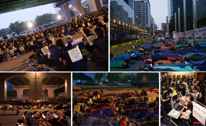 The next day, we declared an indefinite general strike and ordered all members to gather in Seoul. One thousand workers stopped work and headed to Seoul. From Monday to Saturday, they spent their days continuously protesting, holding an outdoor sit-in and sleeping on the streets in front of Samsung Group’s headquarters.