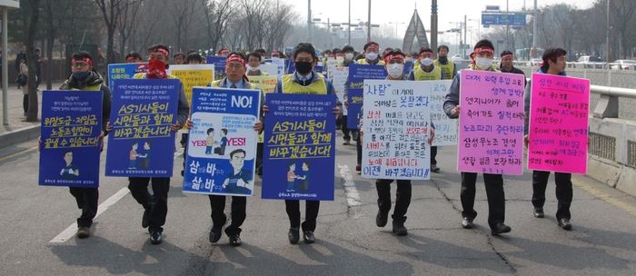 The labor union had to start the struggle immediately. At the time, Samsung's refusal to negotiate prevented the workers from legally securing the right to strike. They had to take a somewhat indirect approach and conduct the strike throughout the winter. Among the union members spread across about 50 centers, the union leaders stopped working illegally and rested, gathering in front of the Samsung Group headquarters in Gangnam, Seoul, where they camped out all winter to continue the struggle. Through that struggle, they achieved a small victory against Samsung.