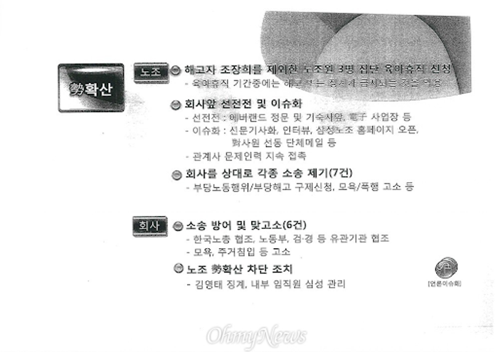 Samsung maintained a no-union policy for 80 years. Whenever workers working at Samsung tried to form a labor union, the company made every attempt to destroy the union by kidnapping, surveillance, threats, or bribery. In 2012, when the company’s labor-management strategy documents were exposed, it clearly revealed how Samsung prepared meticulously detailed strategies to maintain the no-union policy and destroy labor unions.