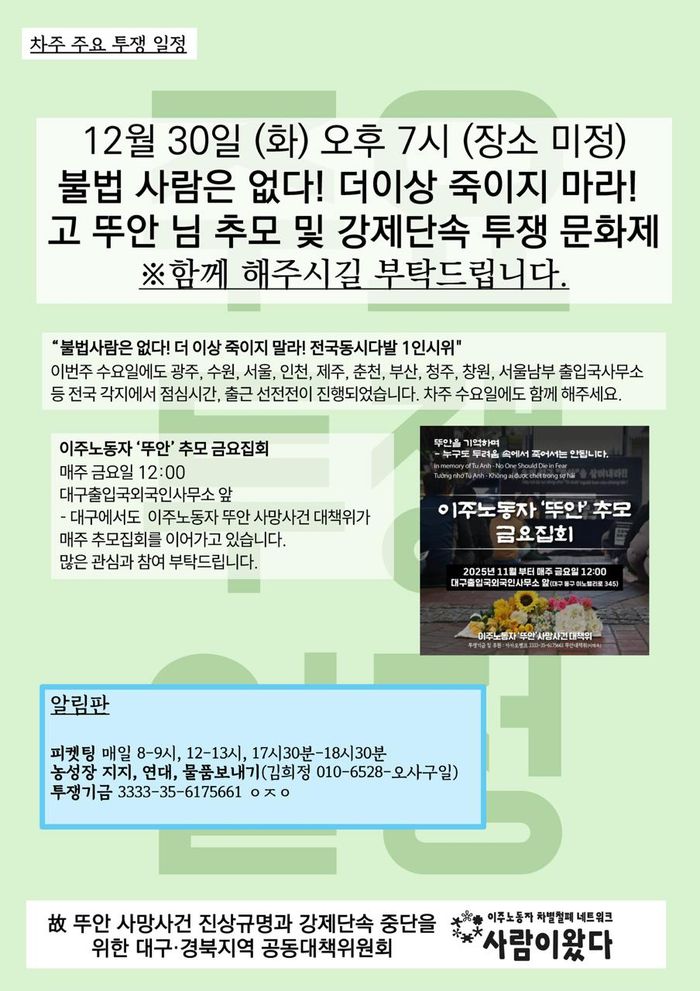 뚜안 씨가 세상을 떠난 지 두 달이 됐지만, 정부의 책임 있는 답변은 아직 나오지 않고 있다. 하지만 매일 점심의 외침과 화요일 저녁의 집회, 그리고 용산의 노숙농성은 뚜안 씨가 남긴 마지막 질문을 우리 사회에 던지고 있다. “누가 이들을 죽음으로 내몰았는가?” 이재명 정부의 폭압적이고 살인적인 대규모 강제추방 정책이 낳았다.