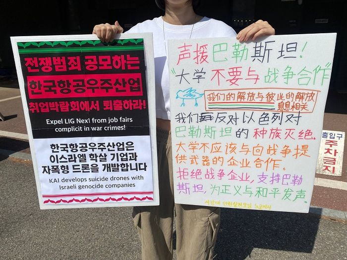 올해 대학 취업박람회에는 LIG넥스원, 한화에어로스페이스, 한화시스템, 한국항공우주산업 등 집단학살에 연루된 대표적인 기업들이 초청장을 받았다. 그러나 팔레스타인 집단학살에 가담하는 기업들이 취업박람회에 참가해서는 안 된다. 작년부터 여러 학생자치단위들이 이에 문제 제기를 했음에도 해당 기업들의 참여가 철회된 경우는 없었다. 2025년 9월에 이어, 올해 3월에도 여러 학교에서 집단학살 공모 기업에 대한 규탄 행동이 진행됐다.