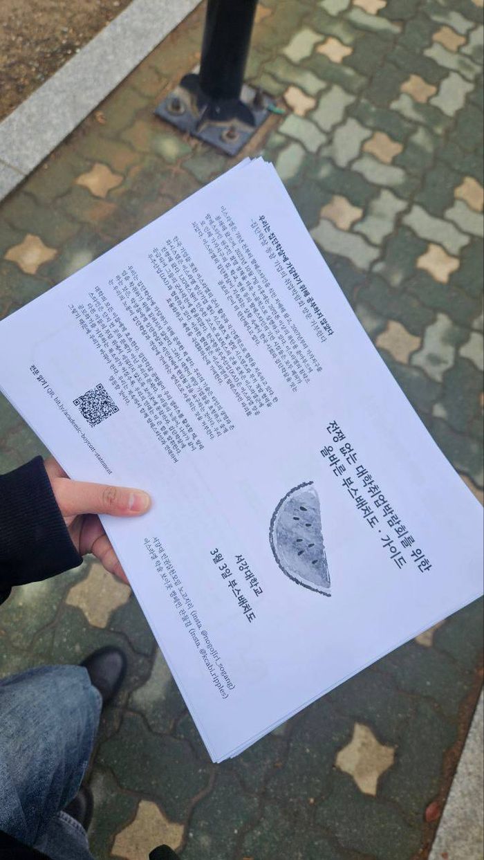 서강대에서도 취업박람회가 열리는 3월 3일부터 6일까지 나흘 동안 집단학살에 공모하는 기업을 대상으로 보이콧이 이루어졌다. 팔레스타인 집단학살에 무기를 지원하고, 이스라엘 무기 기업과 협력하는 기업들인 한화시스템, 한국항공우주산업, LIG넥스원을 보이콧해달라는 취지의 행동이었다. 서강대 인권실천모임 노고지 리(이하 ‘노고지리’)는 취업지원팀에 공문을 보내 학살 공모 기업들의 참여를 거부할 것을 요구했으나, 학생지원팀과의 면담에서 당국은 기업들의 참여를 거부할 의사가 전혀 없었다. 오히려 보이콧 행동을 미리 예고해줘서 고맙다며 교내 정치적 행동을 통제하려는 태도를 취했다. 선전전 장소를 체육관 앞이 아닌 코너에서 하는 것으로 협의해야 했다.